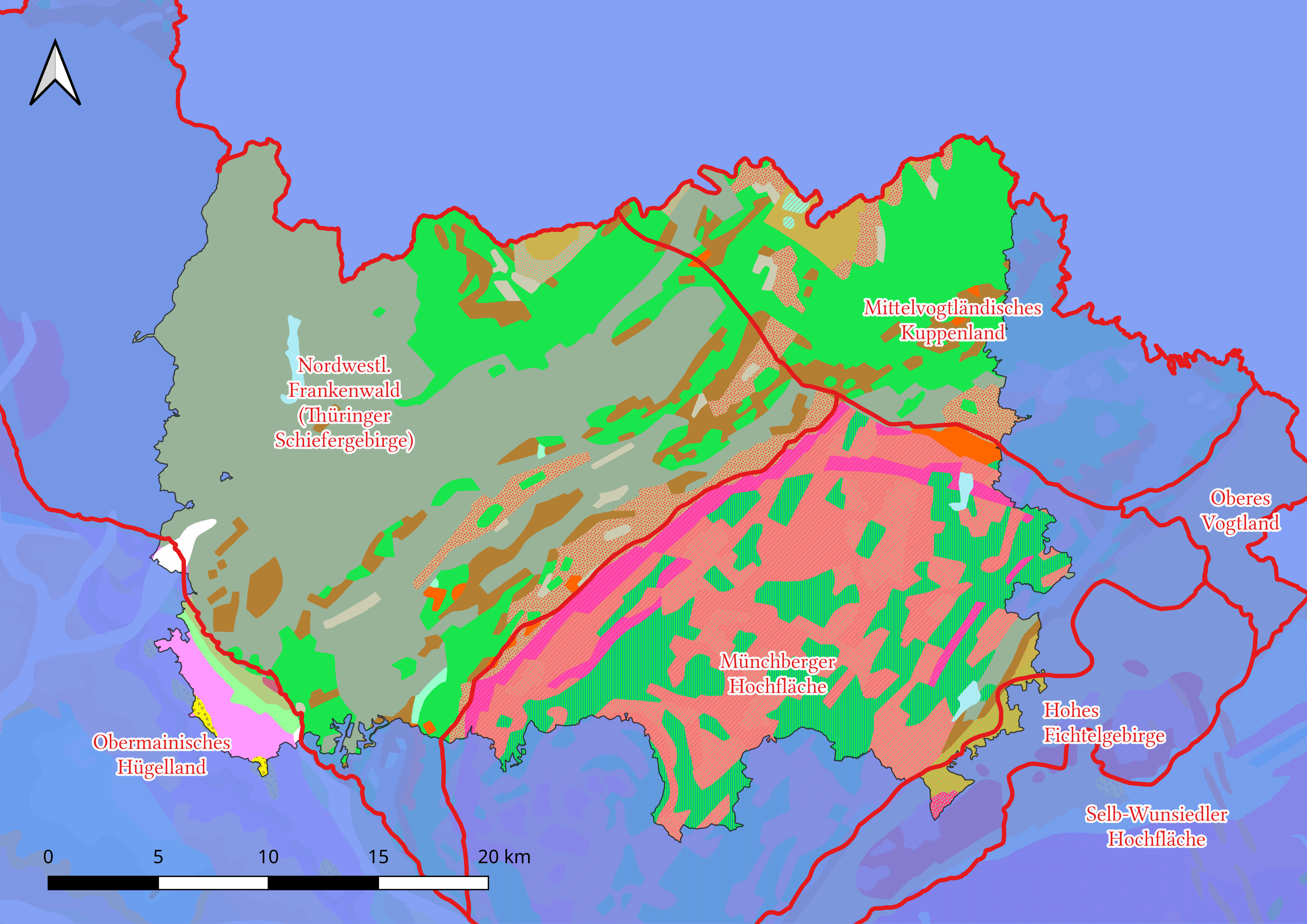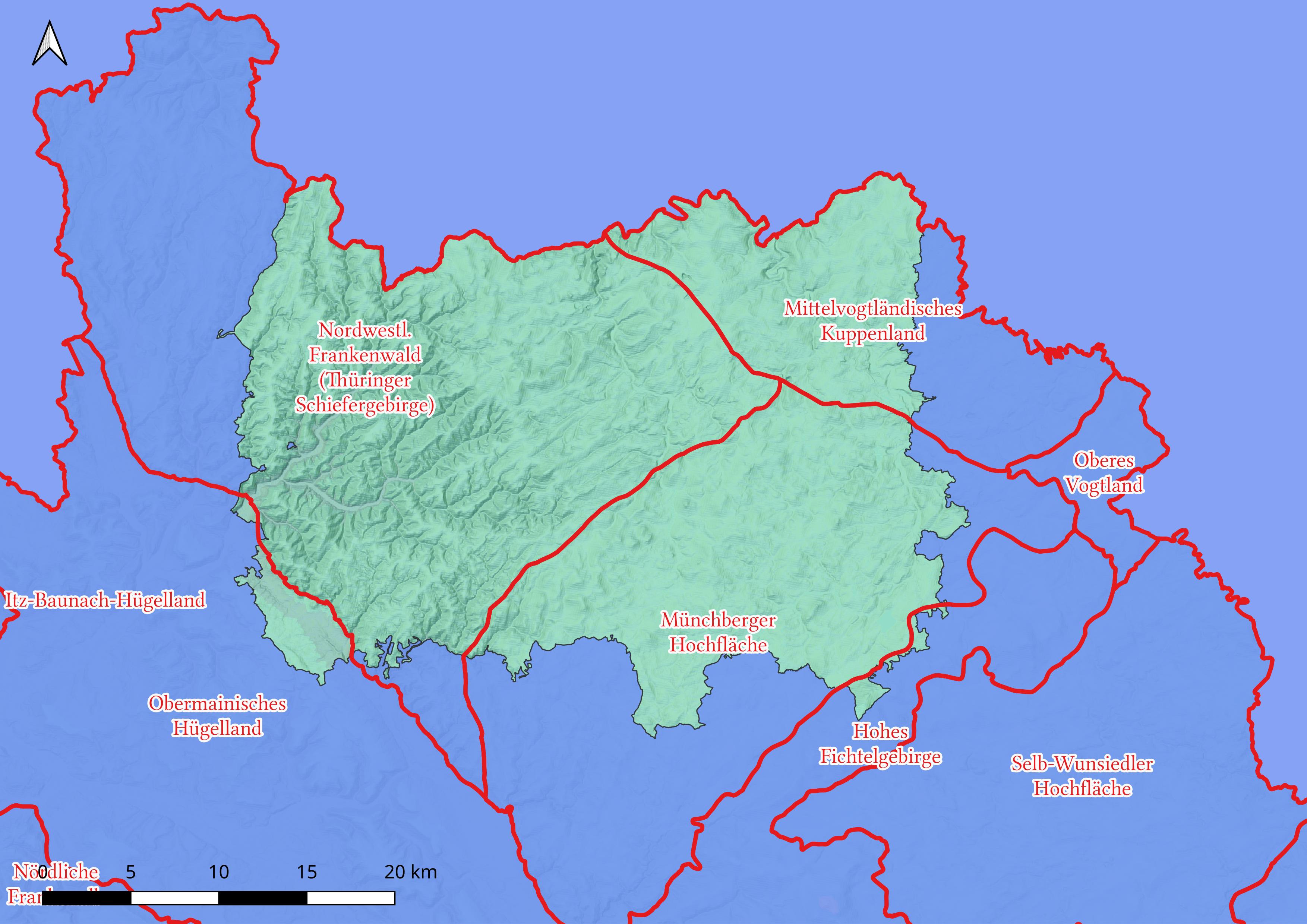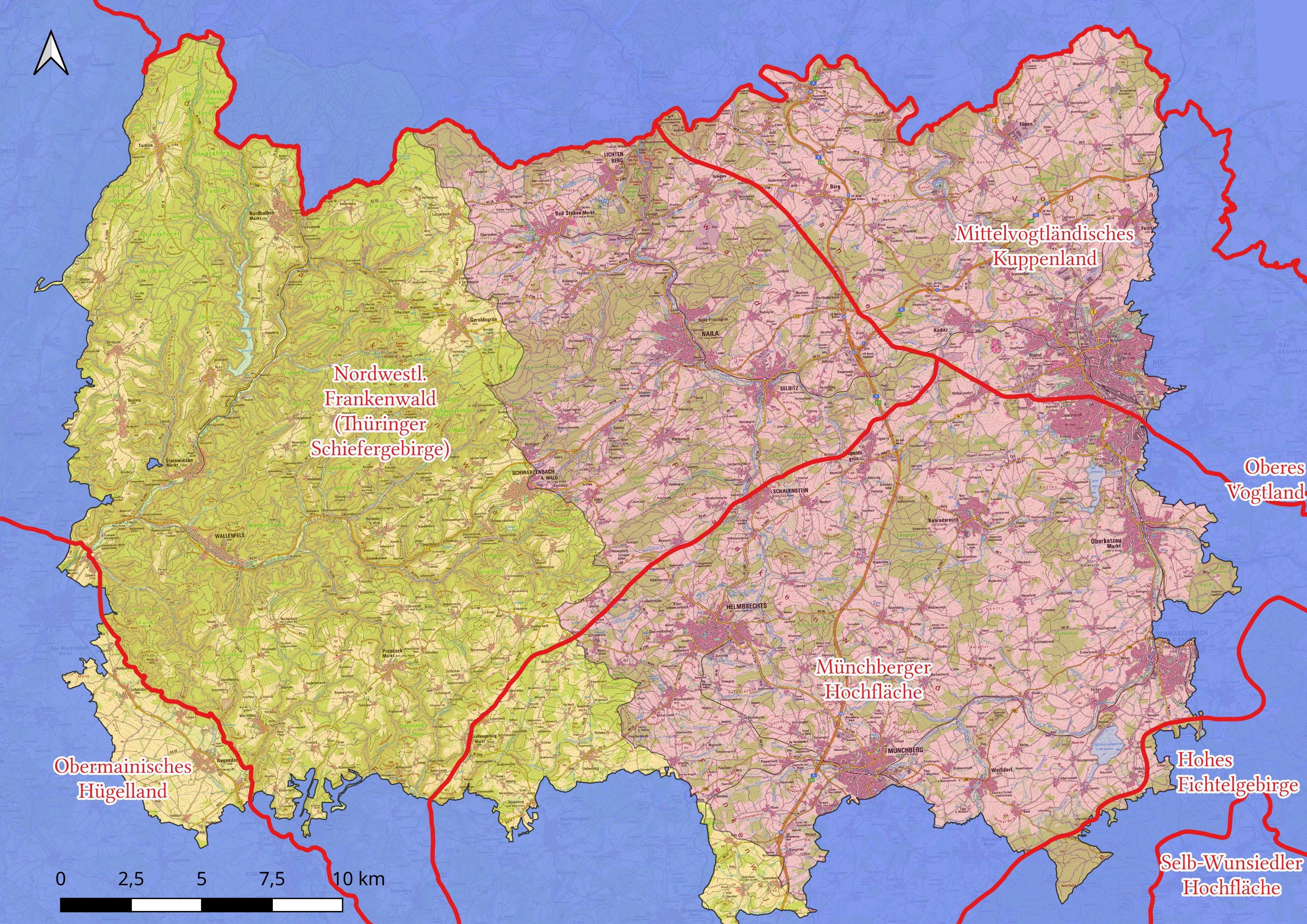 Naturräume, Orohydographie und Bewaldung, Kartengrundlage Schummerung,© BVV, Waldflächen (OpenStreetMap)