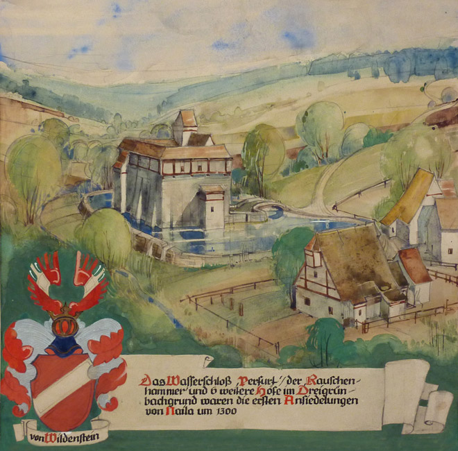 Wasserburg „Perfurt” und Rauschenhammer auf einer Rekonstruktionszeichnung von Reinhard Munzert 1954