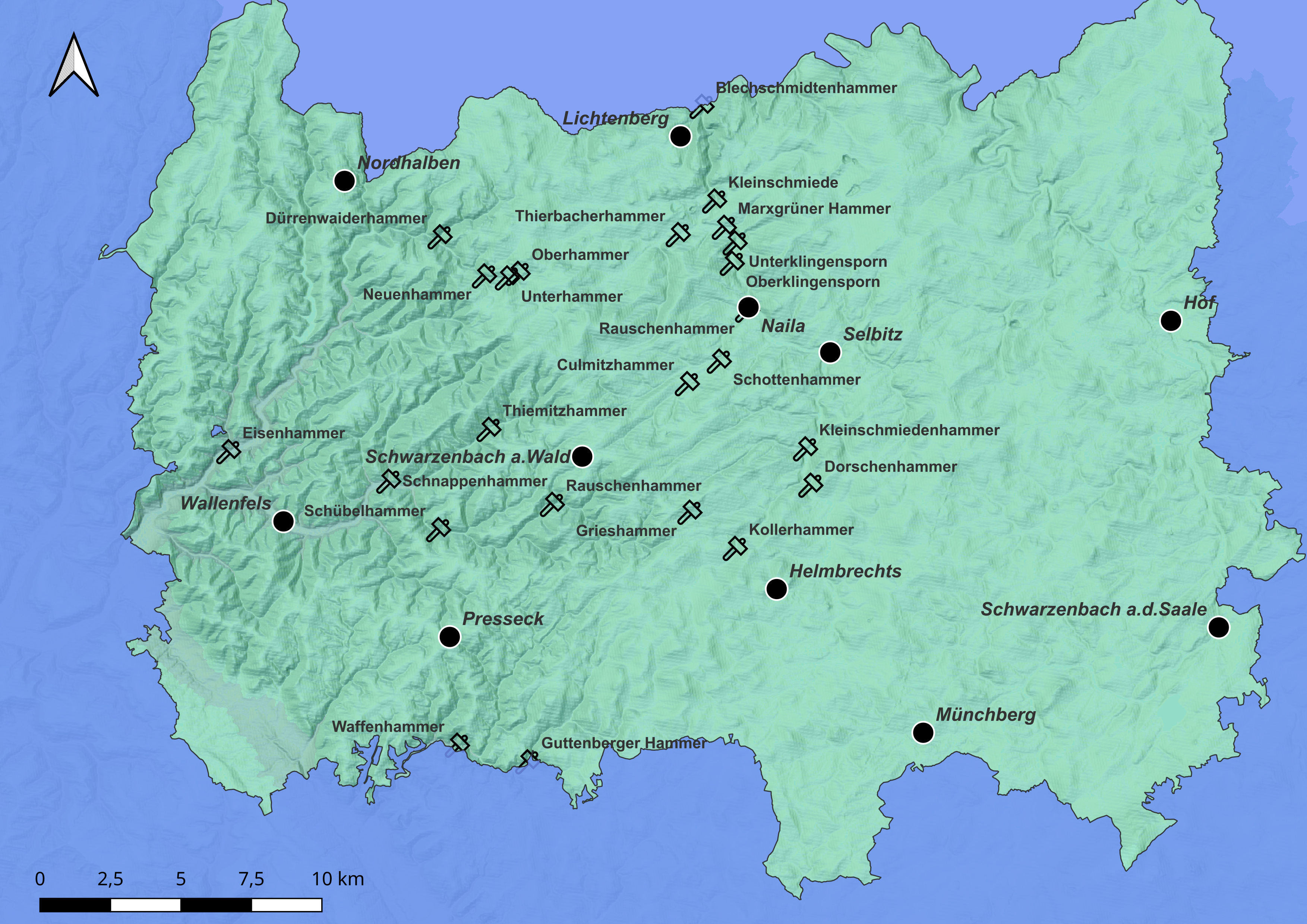 Hammerorte im Betrachtungsraum. Kartengrundlage: Schummerung © BVV, GIS-Bearbeitung: Thomas Gunzelmann