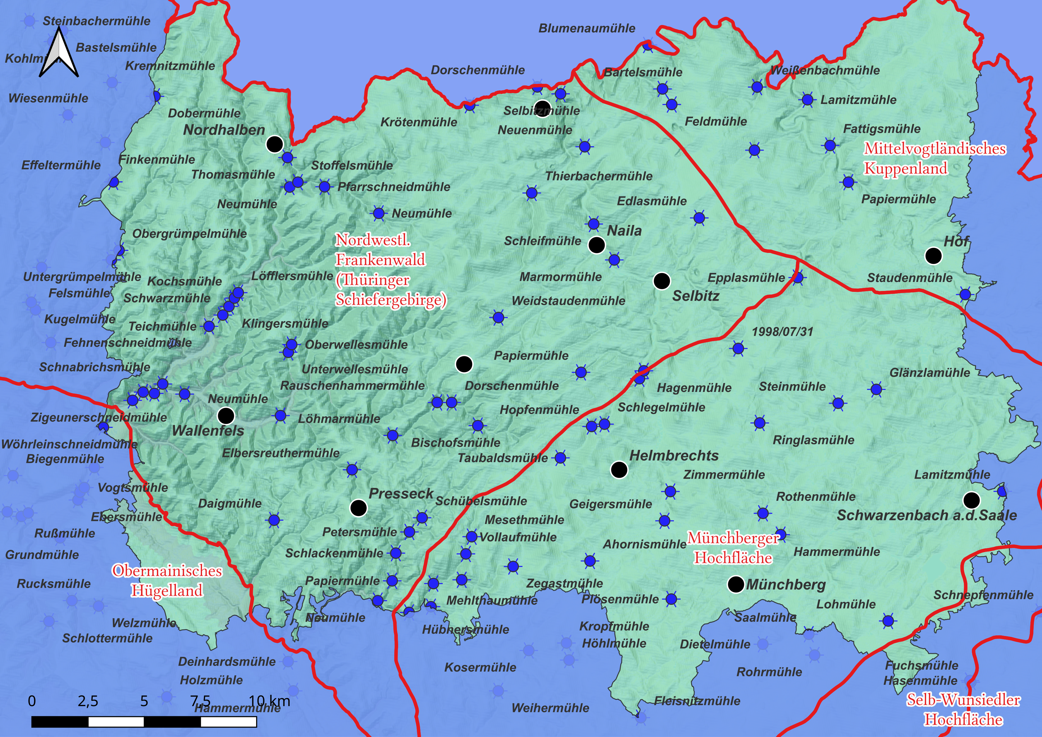 Mühlen als eigenständige Siedlungen im Betrachtungsraum. Innerhalb von Ortschaften gelegene Mühlen sind nicht erfasst. Kartengrundlage: Schummerung © BVV, GIS-Bearbeitung: Thomas Gunzelmann
