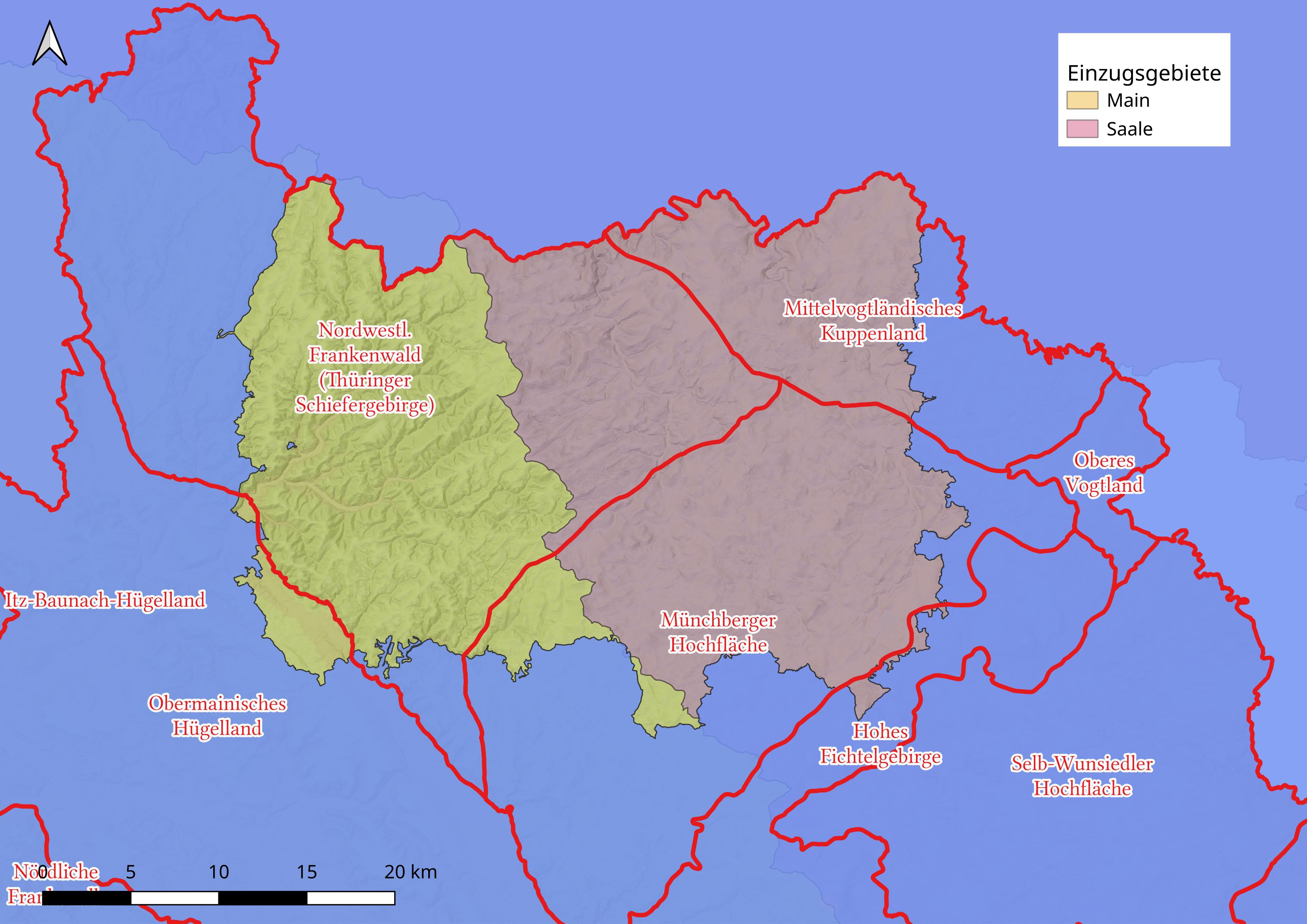 Einzugsgebiete Main/Rhein – Saale/Elbe. Kartengrundlage: Schummerung © BVV, GIS-Bearbeitung: Thomas Gunzelmann